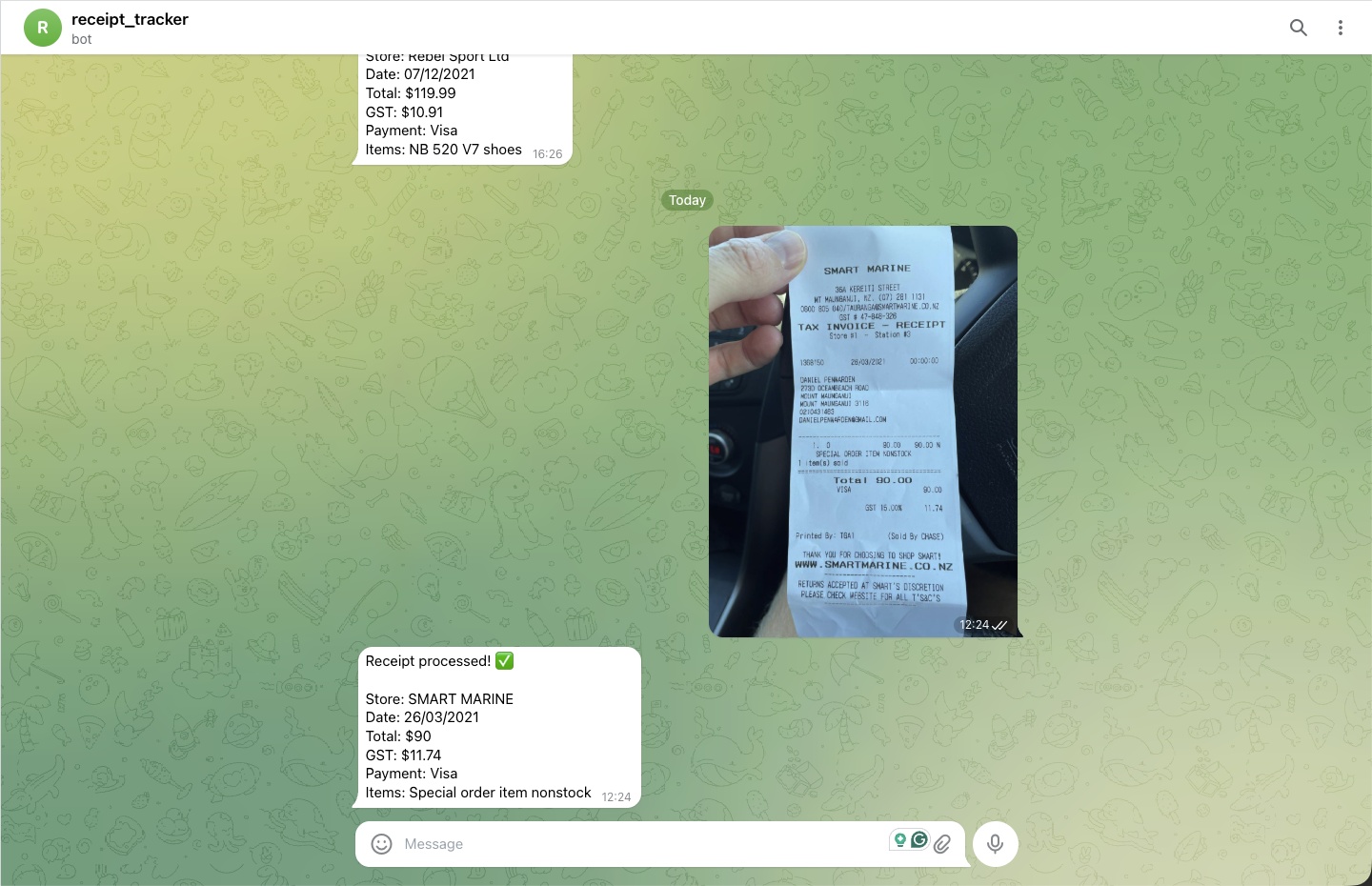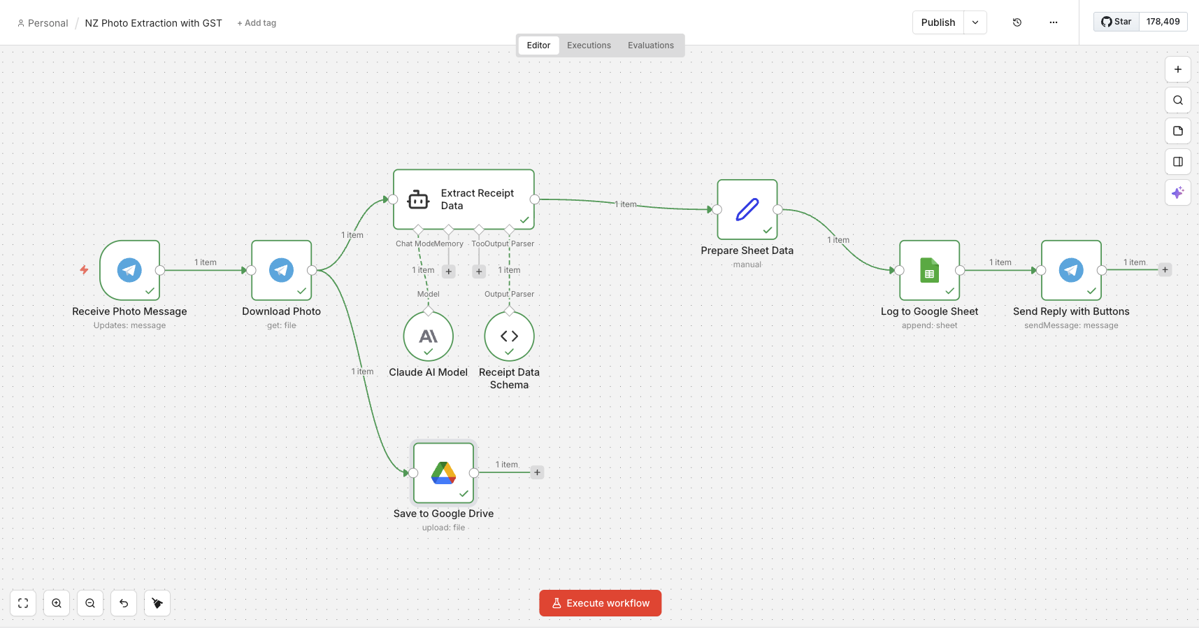 Snap a photo, send to Telegram — AI reads the store, total, GST, and payment method, then logs everything automatically to Google Sheets and saves the image to Google Drive.